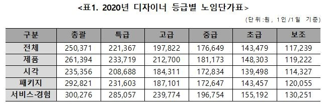 KODIA 로고 (사진제공: 한국디자인산업연합회)금일 (사)한국디자인산업연합회가 2021년 적용「디자이너 등급별 노임단가」를 공표했다. (통계작성승인번호 제448001호)표1. 2020년 디자이너 등급별